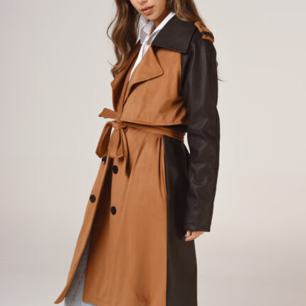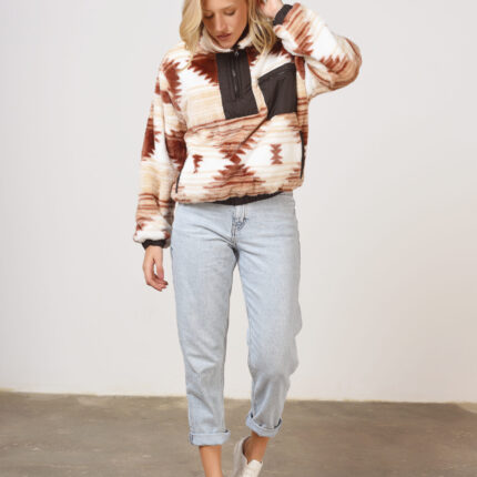 Buzo de piel estampada con cuello alto y cierre hasta media sisa, combinado en ciré, y detalle de bolsillo de pecho en ciré con cierre. Ambos cierres de plástico diente de perro. Puños y cintura con elástico embutido.