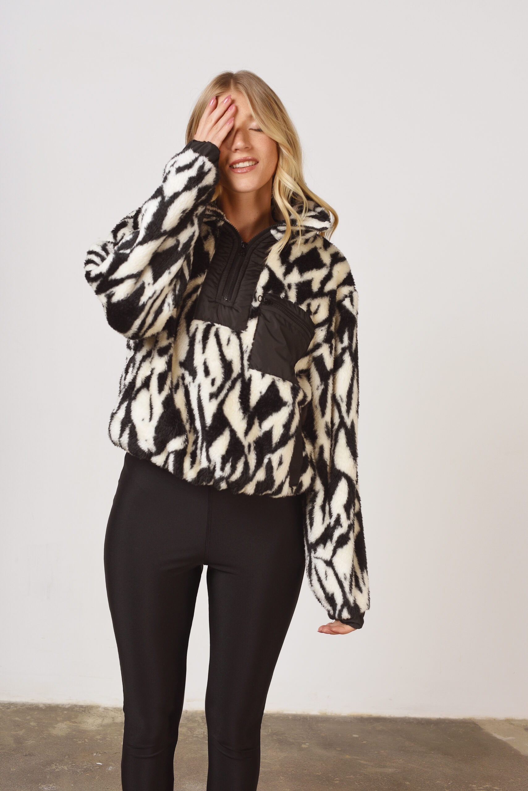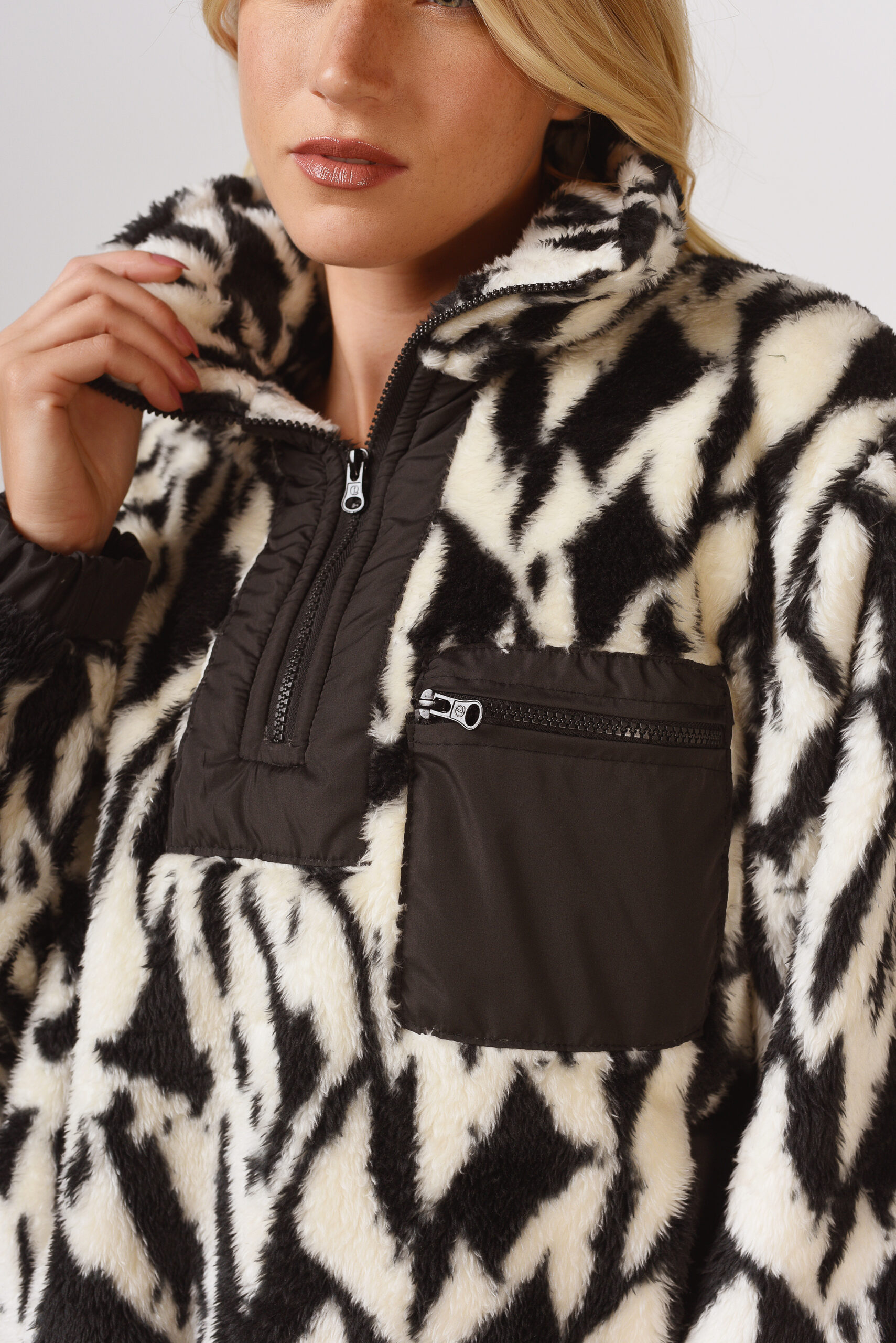 Buzo de piel corderito doble estampada con cuello alto y cierre hasta media sisa, combinado en ciré, y detalle de bolsillo de pecho en ciré con cierre. Ambos cierres de plástico diente de perro. Puños y cintura con elástico embutido.