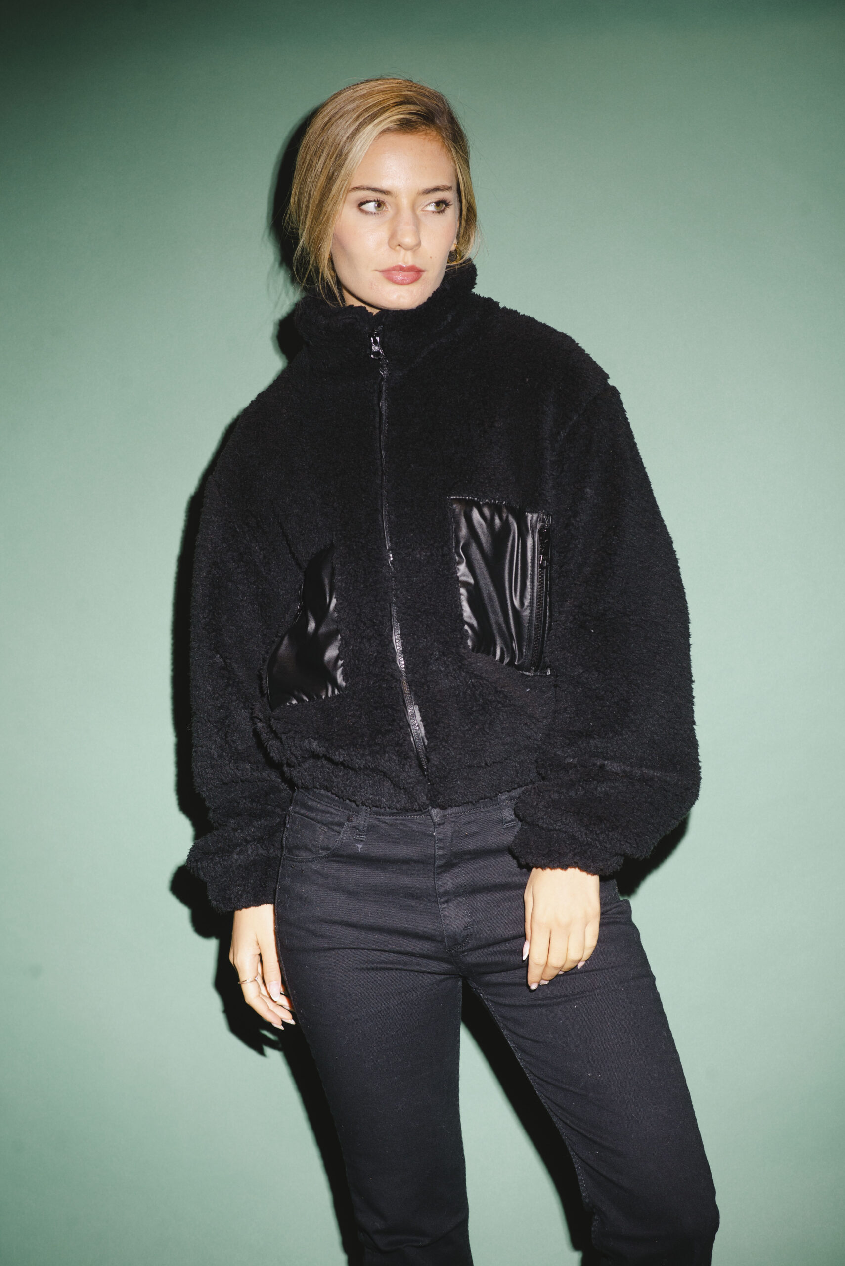 Campera de corderito sintético, cuello alto y detalle en cuero sintético en bolsillos plaque frontales y cintura elástica.