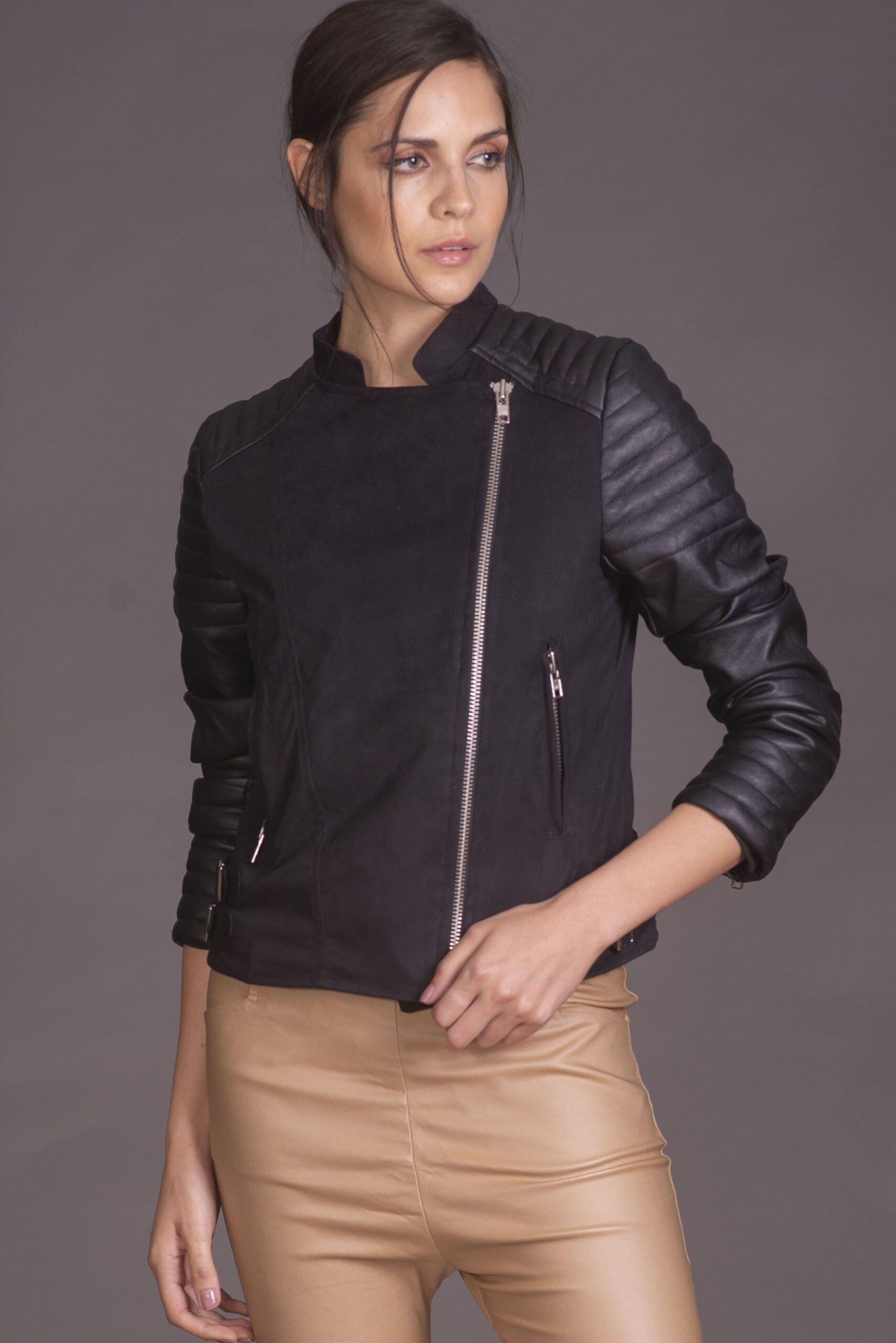 Campera tipo motoquera en cuero sintetico