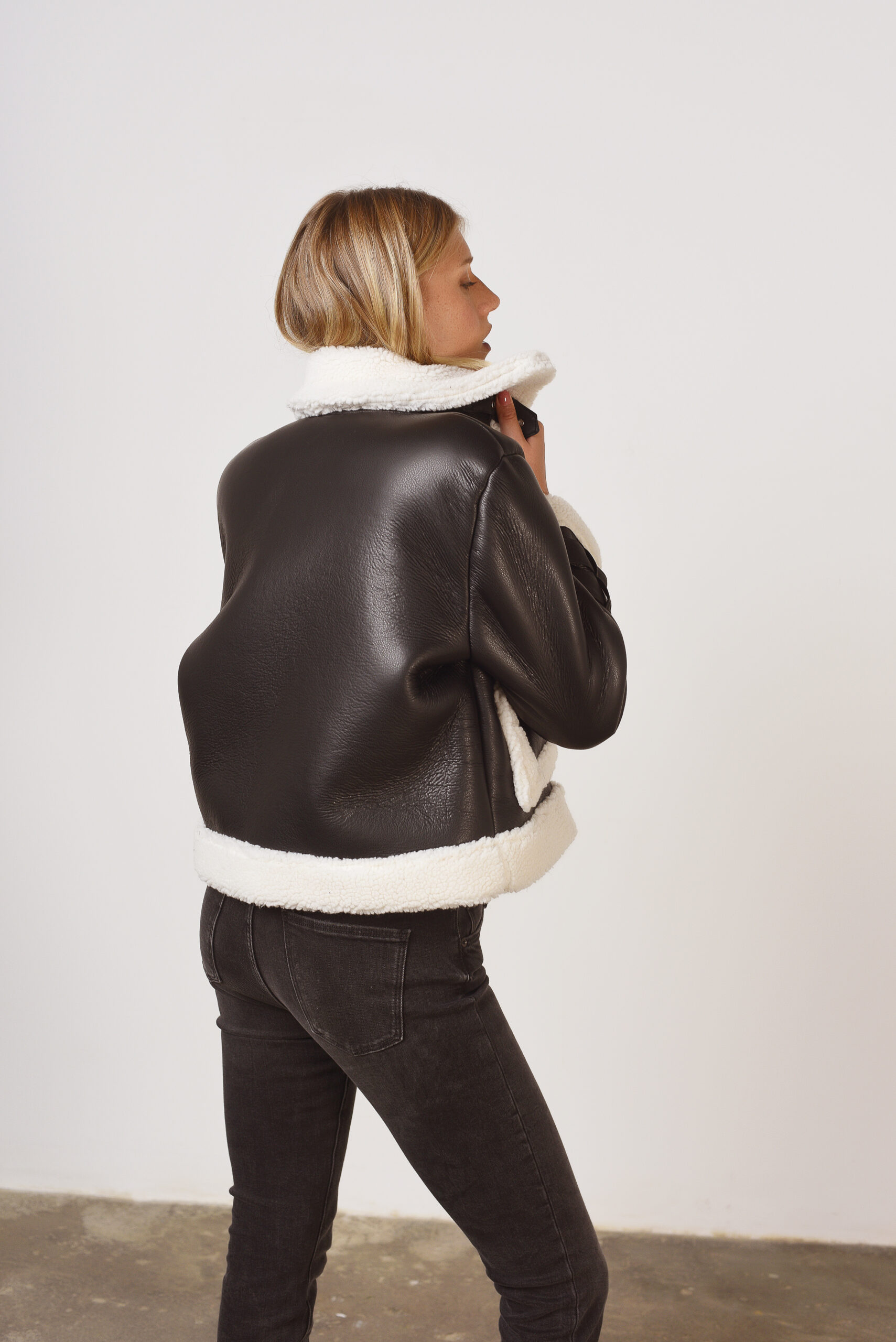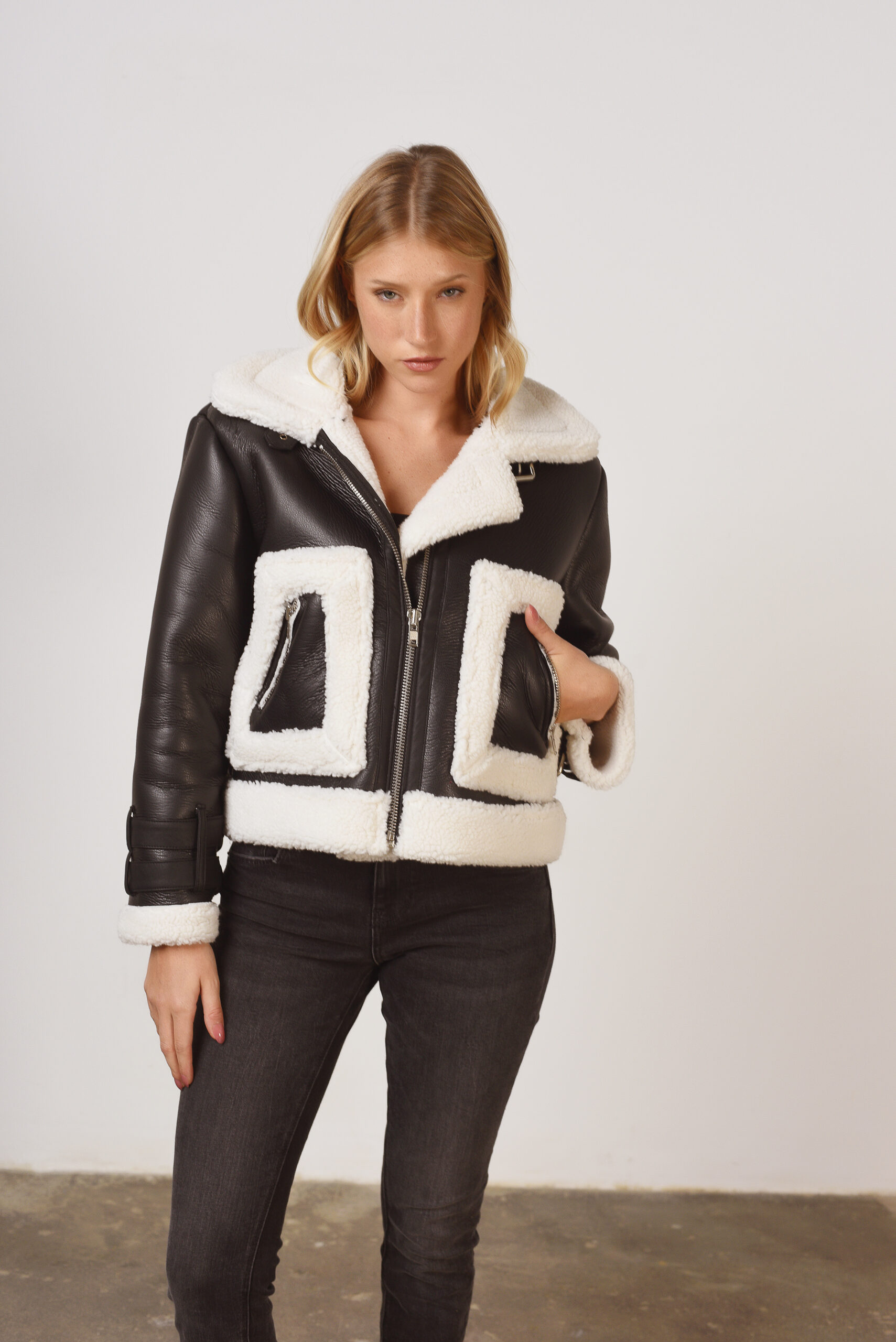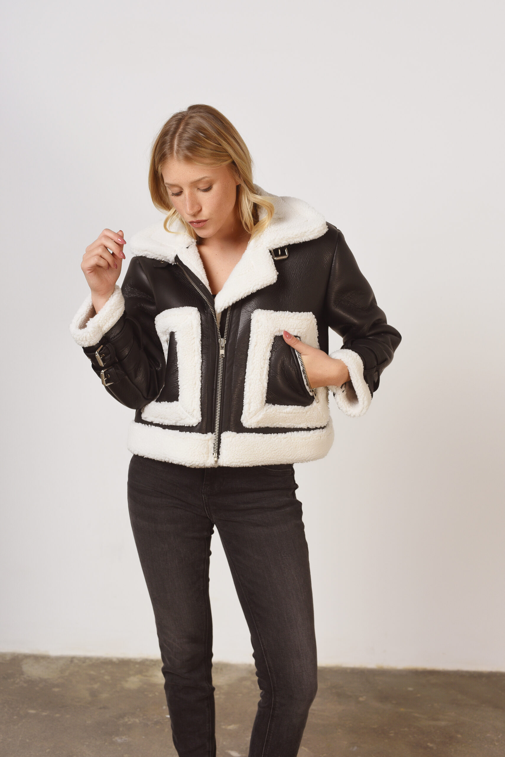 Gamulan corto de caja ancha, PU sintético con interior de Oveja sintético a contratono. Detalle de oveja en bordes de bolsillos delanteros, puños y ruedo. Cierre metalico frontal y en puños. Detalle de cinturones con hebilla en interior del cuello.